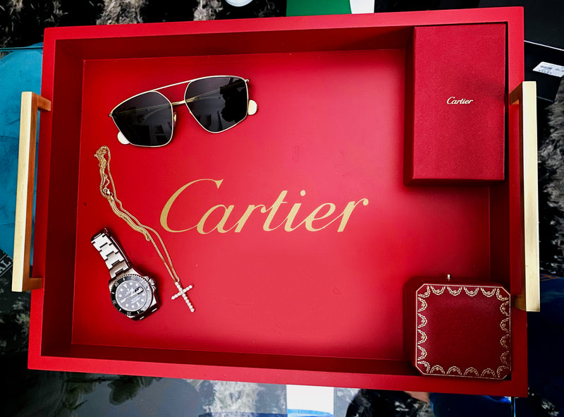 Cartie custom tray can be used for jewelry, a serving tray or just a unique accent decor piece for your home. Logo in center of tray as well as on front right side of the tray.