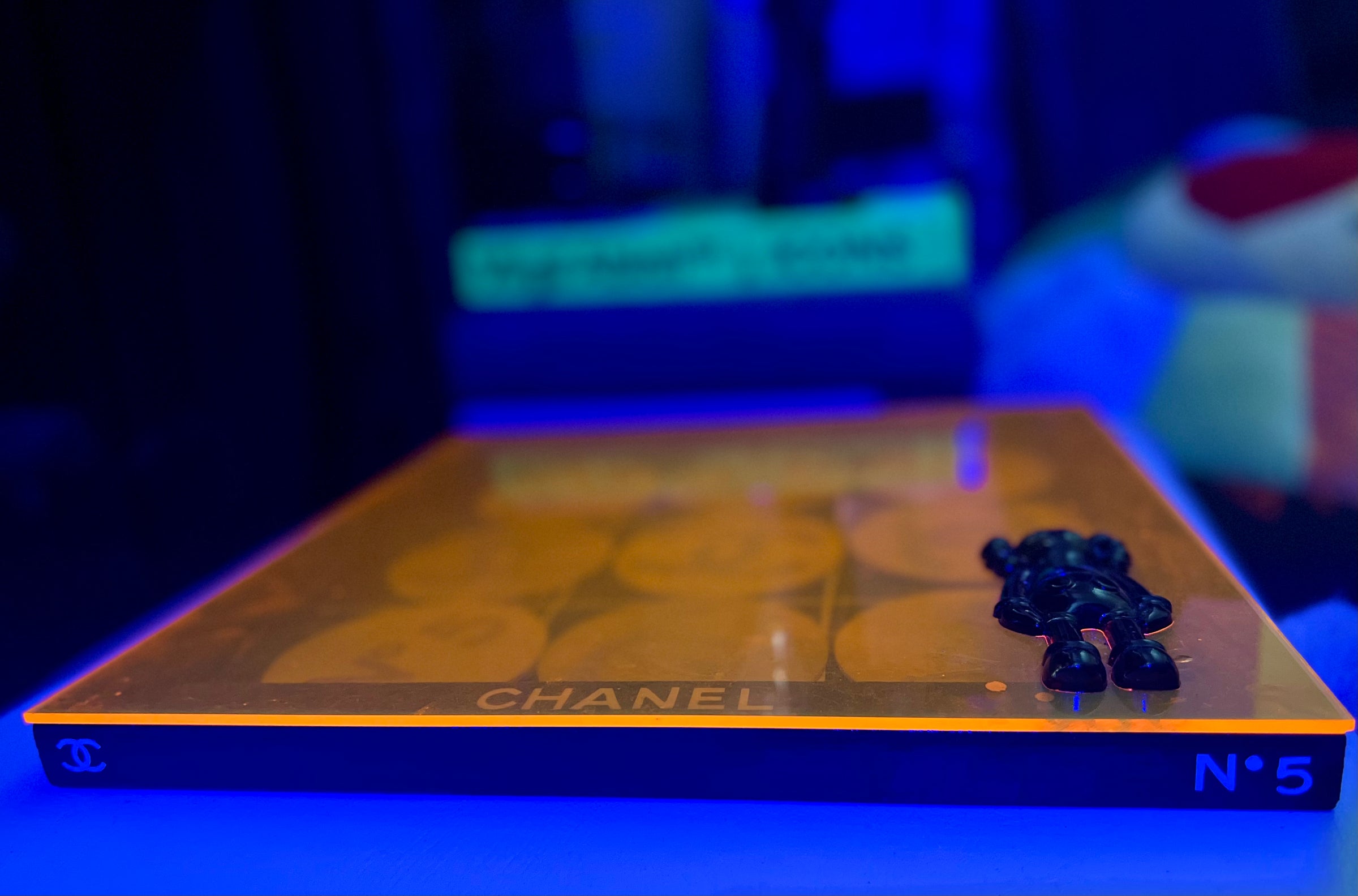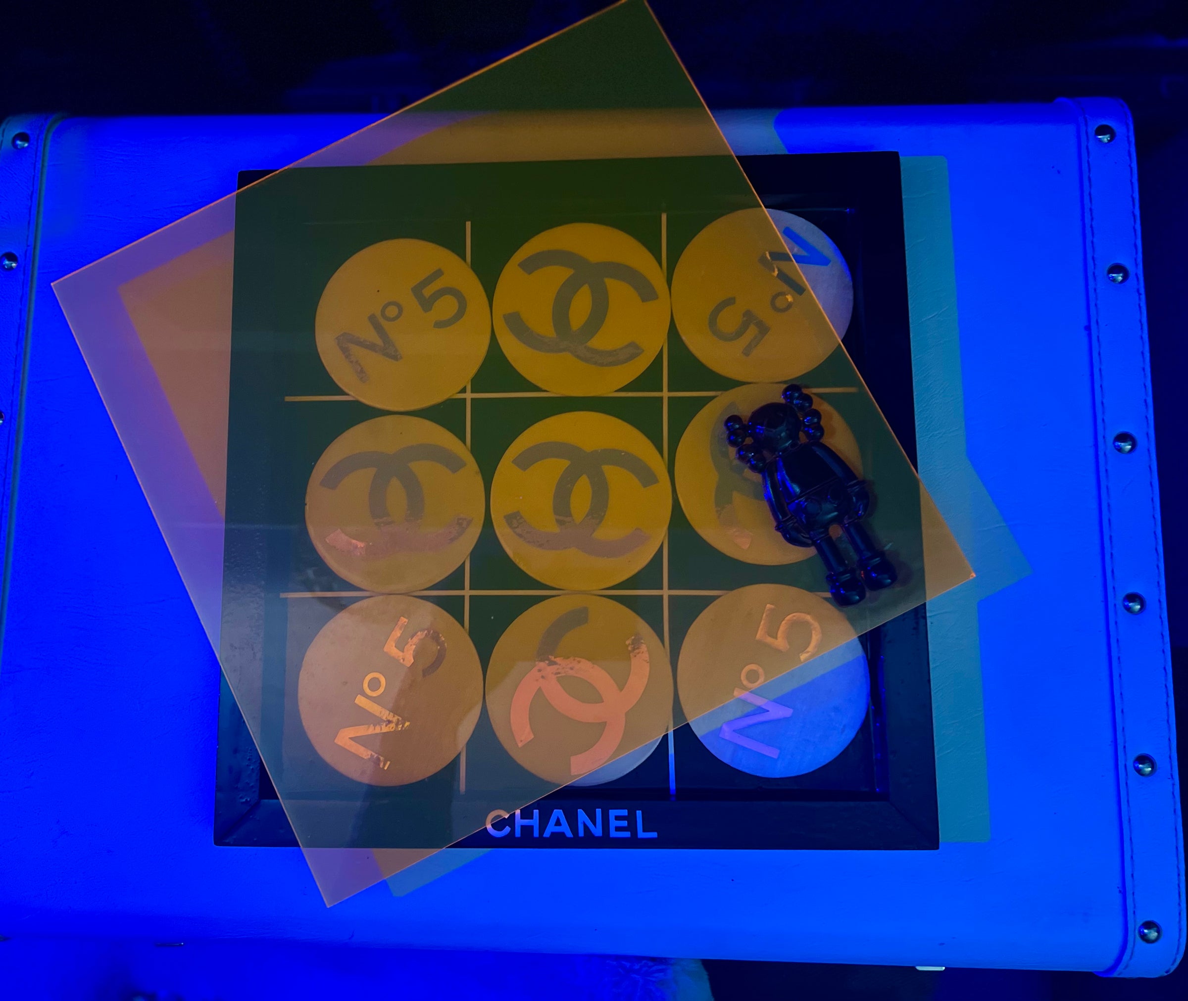 Tic Tac Toe board, plexi glow in the dark Kaws top & 9 playing chips.